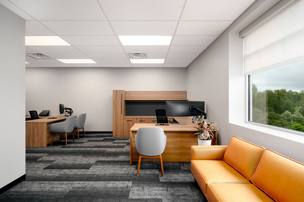 With the next generation of leadership at the helm, BHMG knew they needed to get out of their funeral home-turned offices and into a fresh and cool space that would attract new talent. The utility engineering firm was passionate about the overall “look” of the space, but more importantly, giving their employees the gift of ergonomic seating. BHMG was one of the first organizations to implement the Haworth Zody II and Zody LX into their offices. These chairs have “dual postures” so the user can sit normally, or “perch” while doing their work or sitting in a meeting. The new space has windows lining the entire perimeter and for everyone to benefit from the natural light and have a view of the trees outside, the private offices are in the interior of the floorplan with glass fronts while the bullpen workstations are adjacent to the windows. The original plan was for “L” shaped workstations, but at the very last moment after all the plans were finalized, a change was made to bench-style workstations and P•O•E was able to make the change quickly with no delay to the order. P•O•E worked alongside Eddy Design Group to make BHMG’s vision come to life and they now have a really cool workplace to call home.